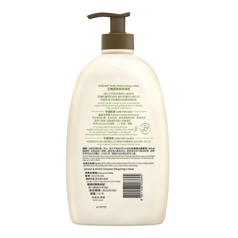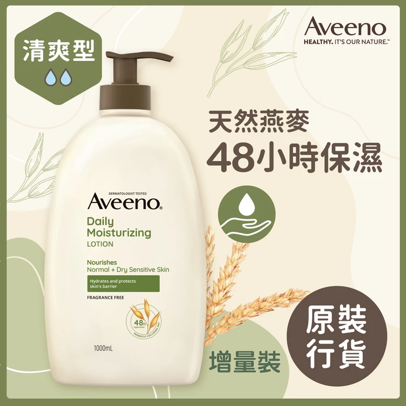 Aveeno Daily Moisturizing Lotion contains natural active ingredient, colloidal oatmeal, to deeply moisturize your skin for 48 hours. The non-greasy, fast-absorbing texture can relieve and protect dry skin by providing temporary relief of the scaling, chapping and itching associated with dry skin. This naturally nourishing formula contains no added fragrance and alcohol, which is recommended by dermatologists. Aveeno Daily Moisturising Lotion leaves your skin soft and smooth with a naturally healthy look.