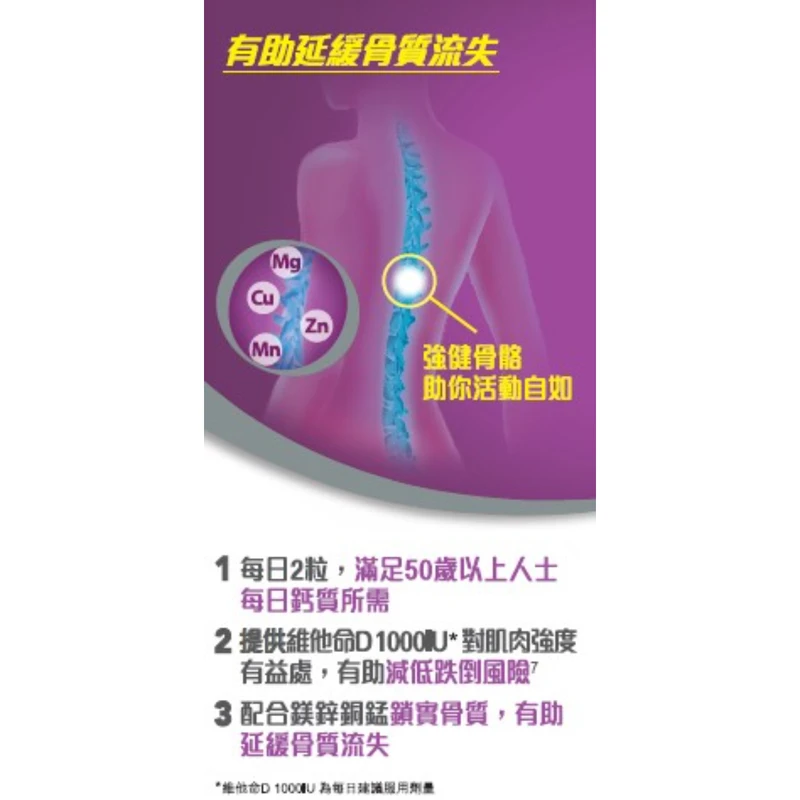 Suitable for Aged over 50+. Provides Calcium, Vitamin D, and 4 added minerals: Mg, Zn, Cu, and Mn, which help reduce bone loss and maintain bone health.
