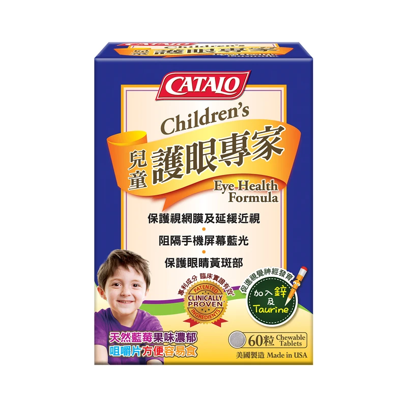 CATALO Children’s Eye Health Formula is specially formulated to protect the health of the eye for children. It contains Mirtoselect® European Bilberry Extract, US patented ingredient ™FloraGLO Marigold Extract, Natural Eyebright Extract and Natural Lycopene, it is clinically proven to relieve eye fatigue and improve vision and filter harmful light (including blue light from digital screen). It is specially formulated with Taurine and Zinc to strengthen healthy retina and neural development and alleviate myopia. With natural fructose and blueberry vanilla flavour, the chewable tablet is delicious and easy to chew.