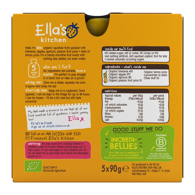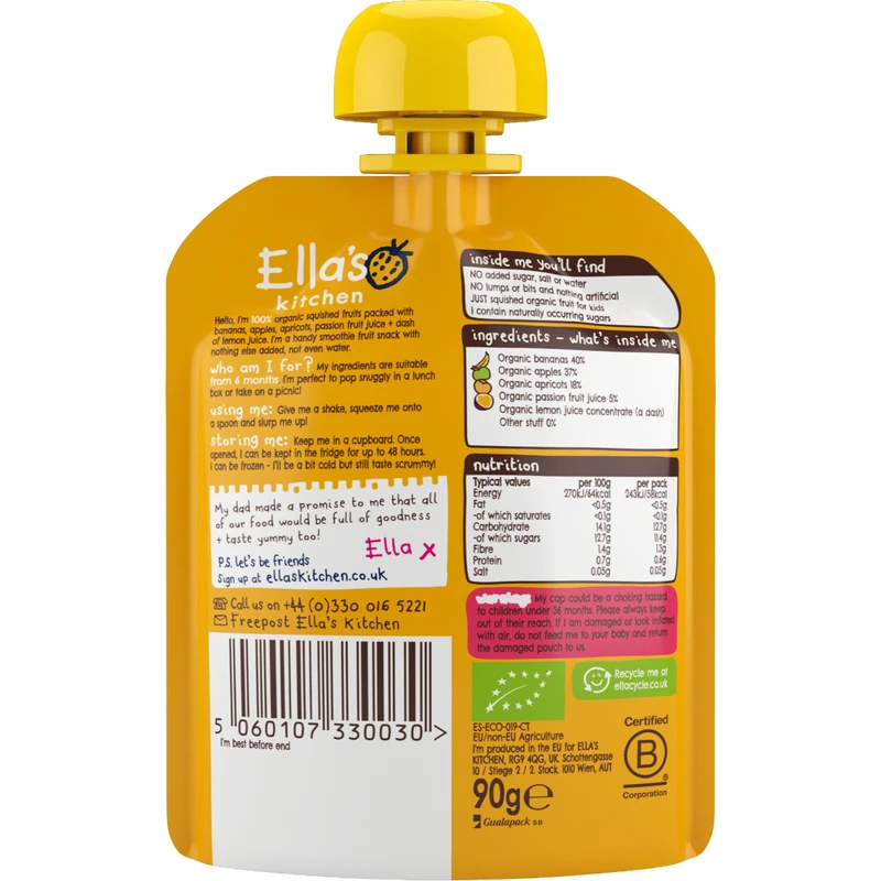 Organic Bananas 45%Organic Apples 33%Organic Mango 15%Organic Apricots 7%Organic Lemon Juice Concentrate (A Dash)