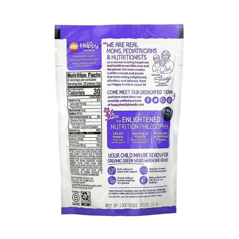 Our blueberry & purple carrot Greek yogis delight Baby’s taste buds with a burst of fruit flavor. These freeze dried organic Greek yogurt drops melt in Baby’s mouth, and they taste so good, you may not be able to resist sneaking a few for yourself!