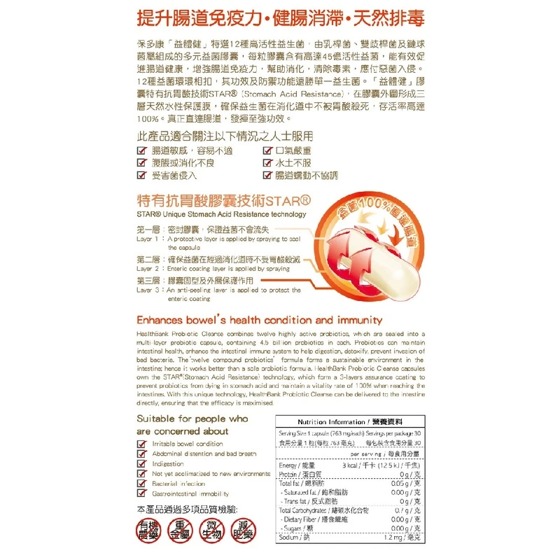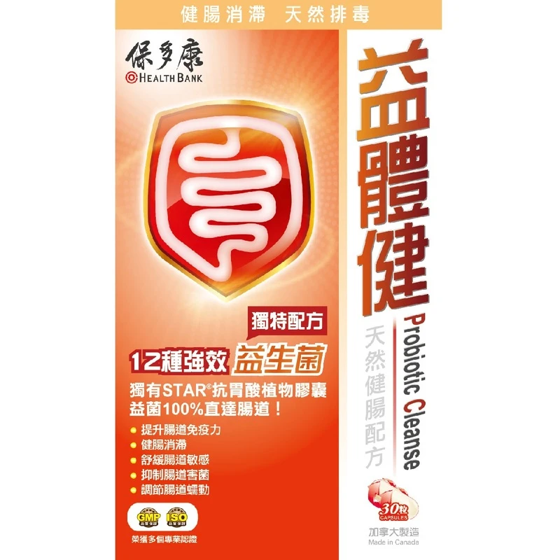 The intestine is the largest immune organ in the human body, containing 70% of the immune system.There are more than 400 species of bacteria in the intestine, including both harmful bacteria and healthy gut flora probiotics. Medical research has shown that an imbalance of the healthy to harmful gut bacteria ratio, or an increase in the harmful bacteria level could lead to issues such as a sensitive bowel; therefore solely relying on 1 type of probiotic is not comprehensive enough to solve the problem. HealthBank Probiotic Cleanse has especially chosen 12 strains of highly active probiotics. Each capsule contains 4.5 billion probiotics to effectively strengthen the immune system in the intestine, aid in digestion, eliminate toxic substances and defend against harmful bacterial infection. It is the first line of defense for intestinal health.