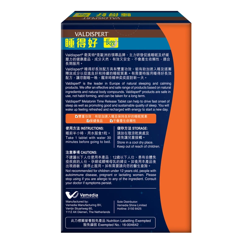 Valdispert® 5mg Melatonin Time Release Tablet can help to drive fast oneset of sleep as well as promoting good and sustainable quality of sleep. You will wake up feeling refreshed and recharged with energy to start a new day.
