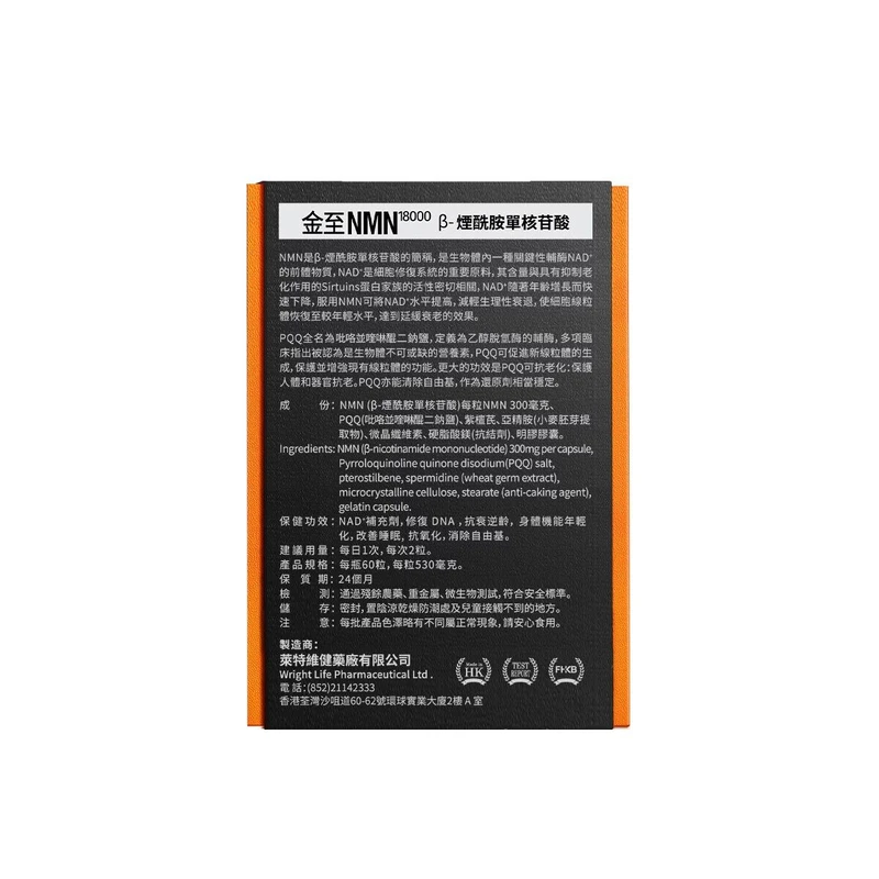Ingredients: NMN (βnicotinamide mononucleotide) 300mg per capsule, Pyrroloquinoline quinone disodium(PQQ) salt, pterostilbene, spermidine (wheat germ extract), microcrystalline cellulose, stearate (anticaking agent), gelatin capsule.